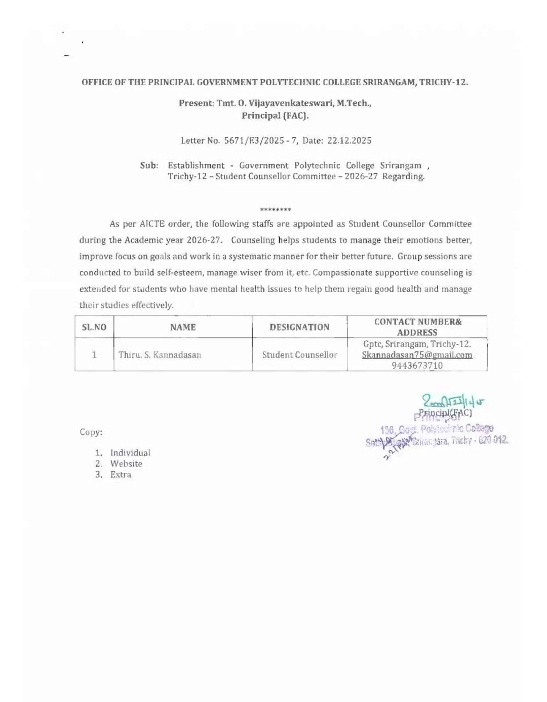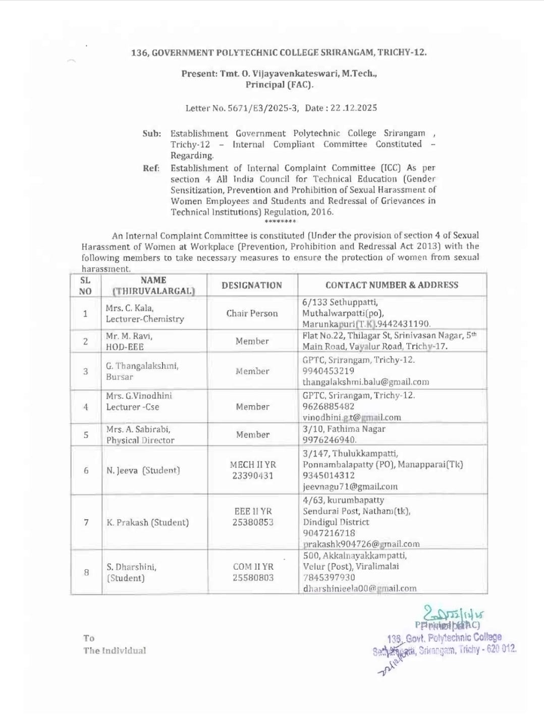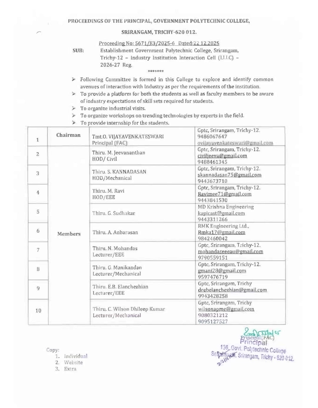 Admission to the Polytechnic College for the three-year Full Time Diploma course is done strictly on the basis of marks scored in the SSLC examination and as per the reservation policy of the Government of Tamil Nadu for OC, BC, MBC, SC & ST candidates. In addition, seats are reserved for the following categories of students. They are selected and allotted by the Directorate of Technical Education, Chennai. Separate applications must be sent to the Directorate for this purpose.